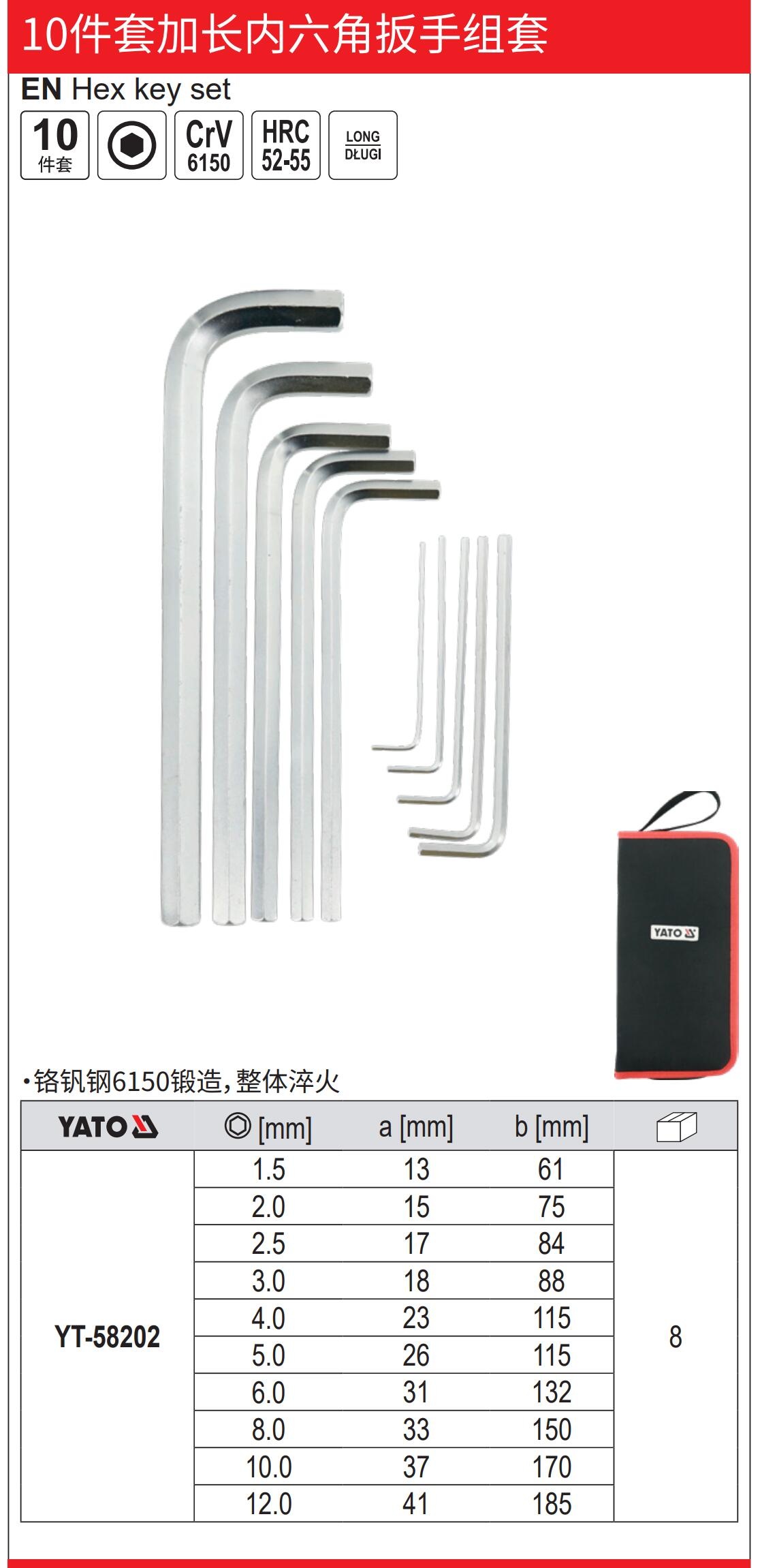 YATO 10件套加长平头内六角扳手CrV1.5-12mm