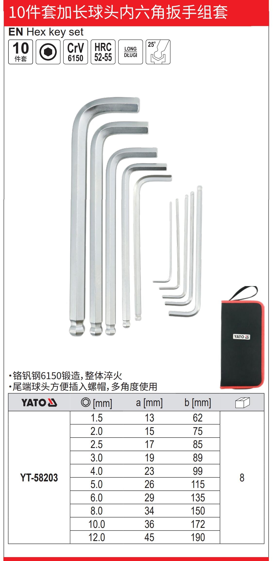YATO10件套加长球头内六角扳手CrV1.5-12mm