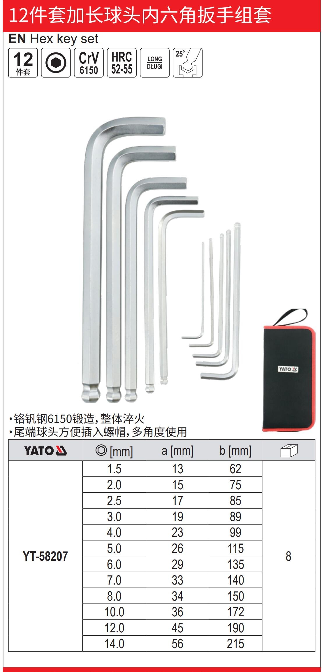 YATO12件套加长球头内六角扳手CrV1.5-14mm