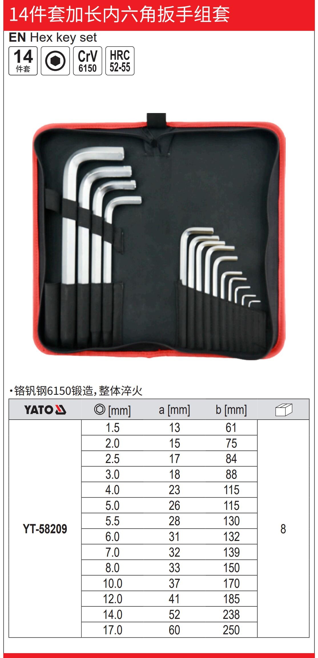YATO14件套加长平头内六角扳手CrV1.5-17mm