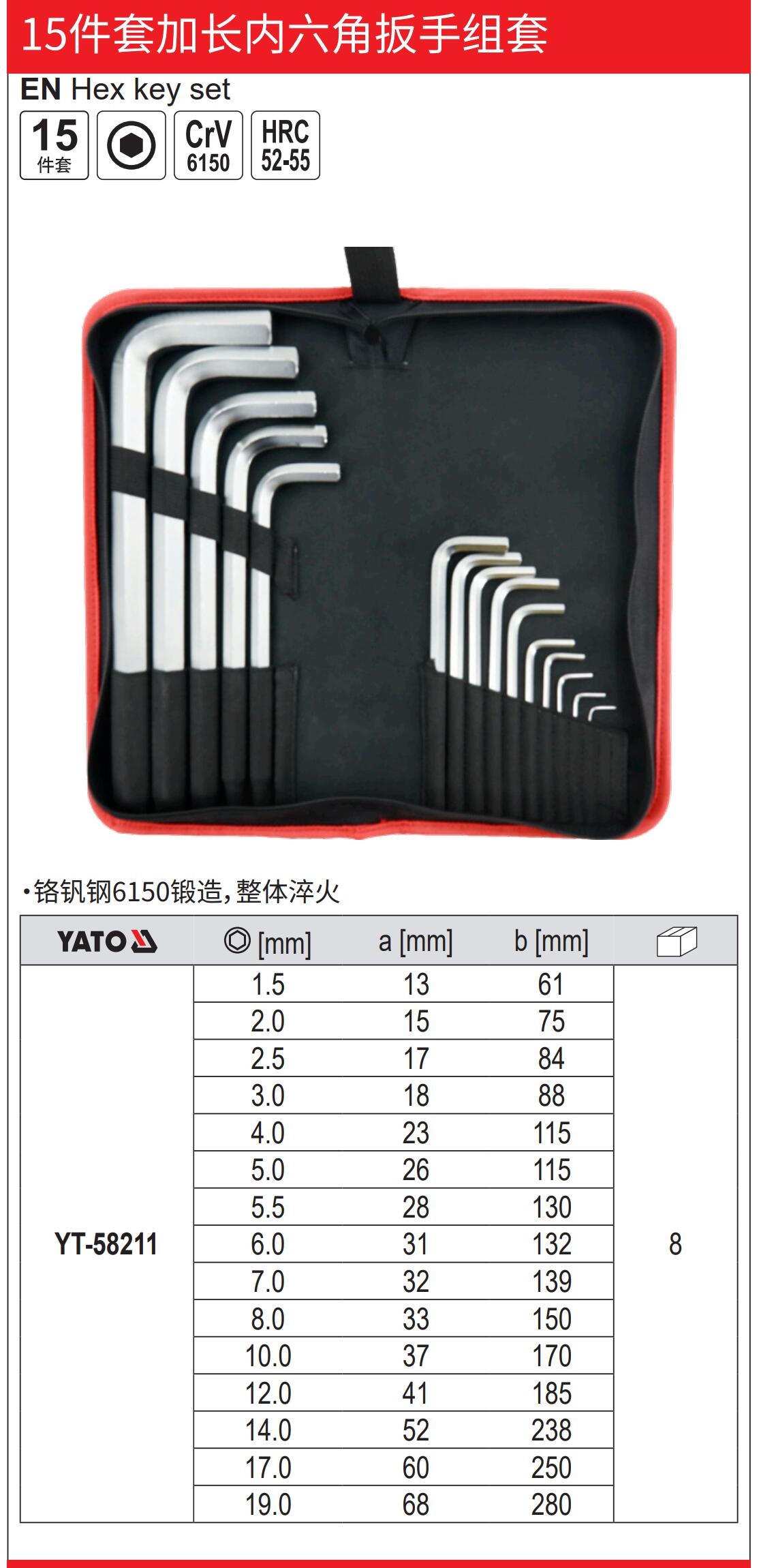 YATO15件套加长平头内六角扳手CrV1.5-19mm