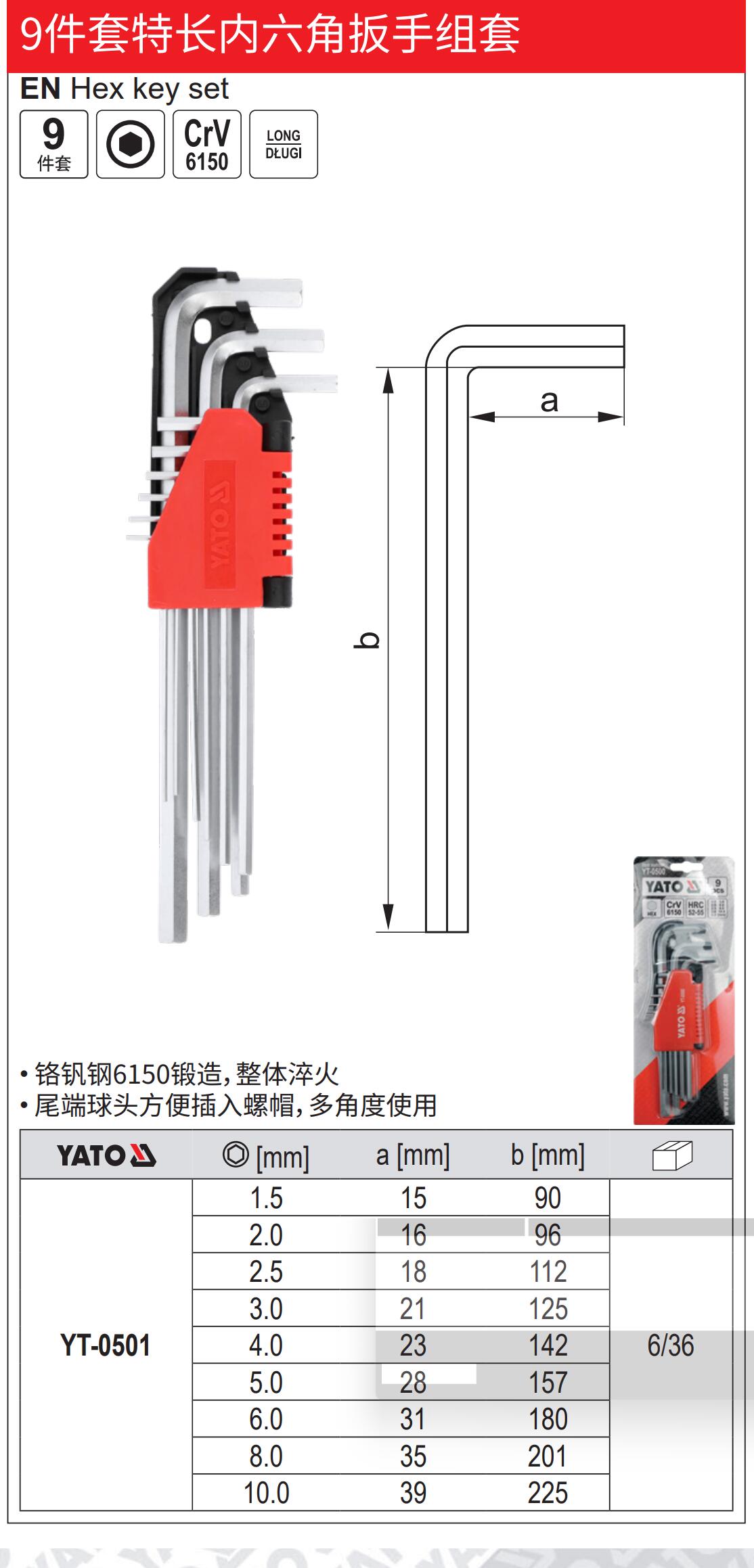 YATO 9件套特长内六角扳手CrV