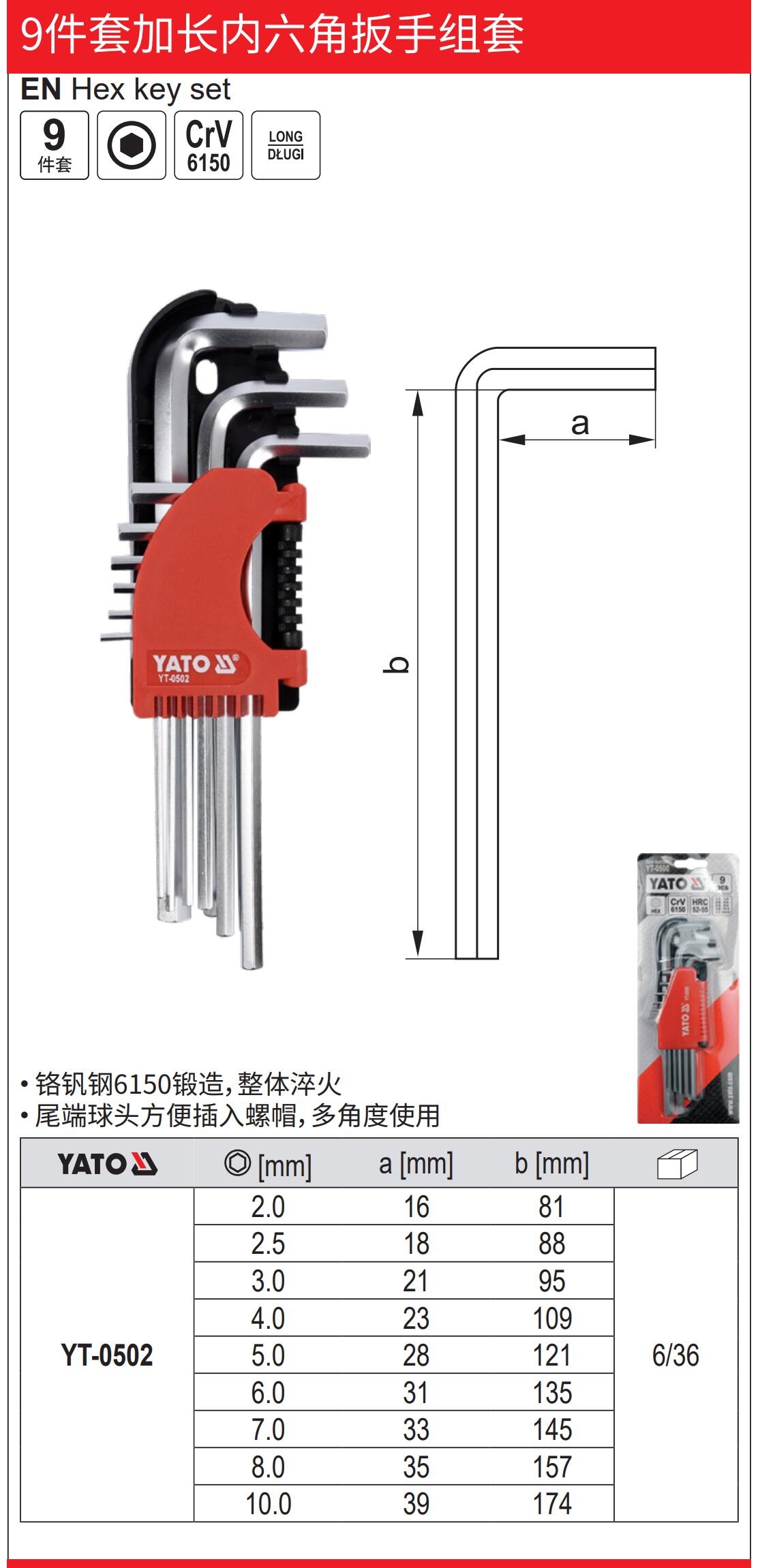YATO 9件套加长内六角扳手CrV