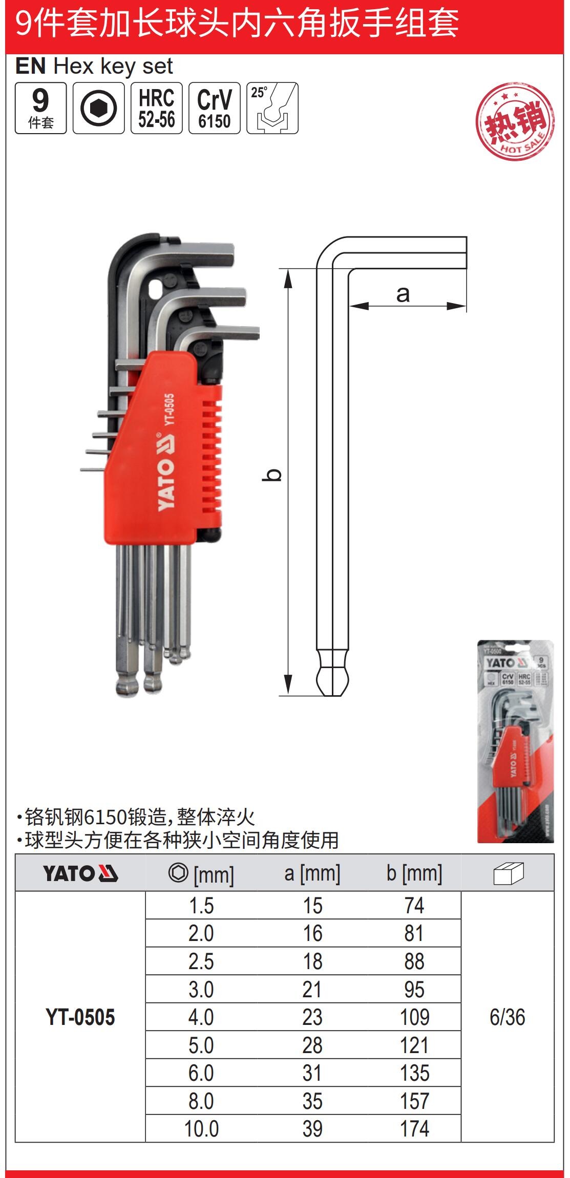 YATO 9件套加长球头内六角扳手CrV