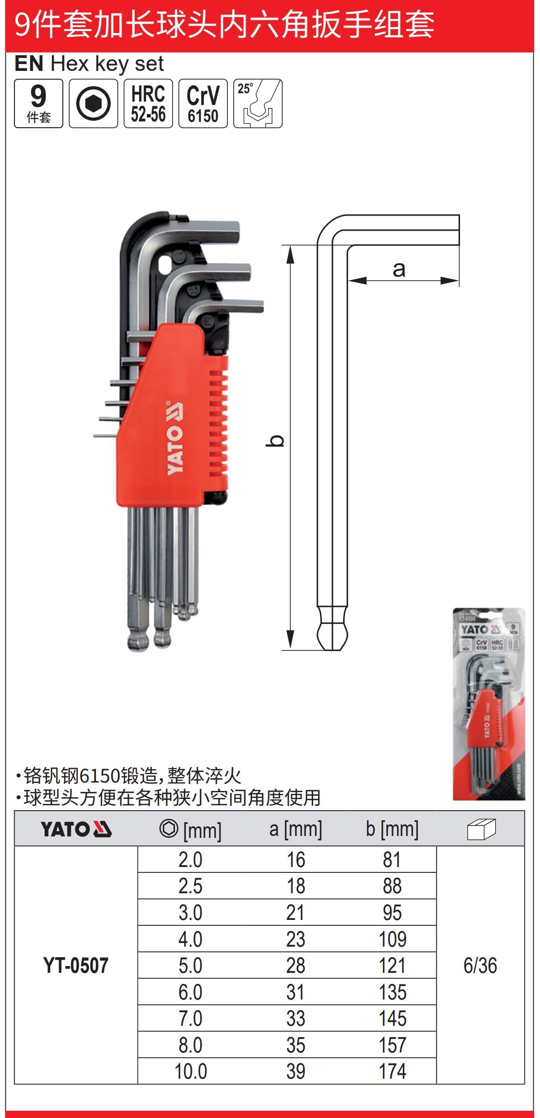 YATO 9件套加长球头内六角扳手CrV
