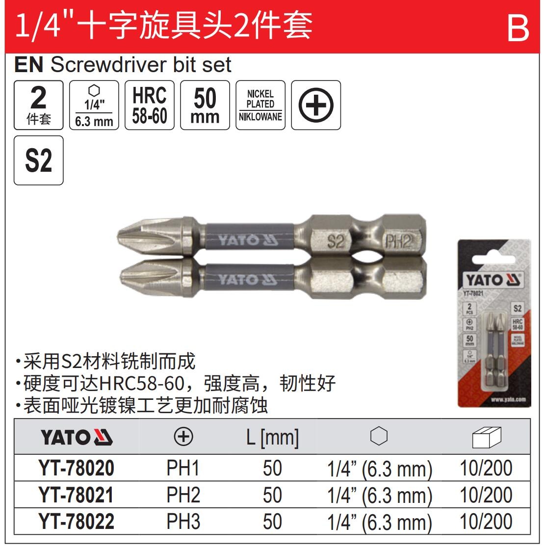 YATO 1/4十字旋具头2件套 PH1-PH3