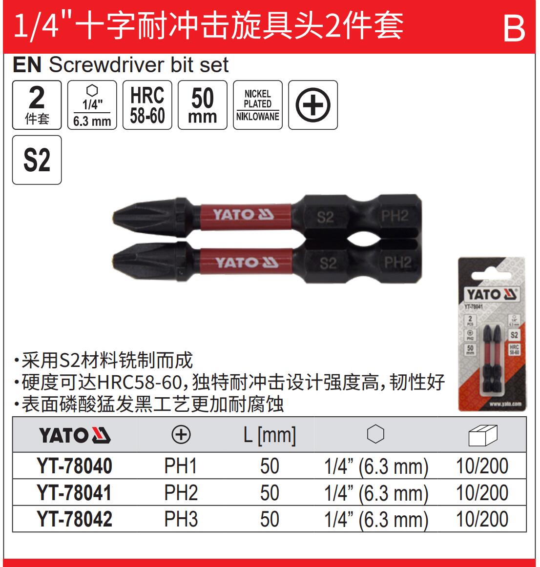 YATO 1/4十字耐冲击旋具头2件套PH1-PH3