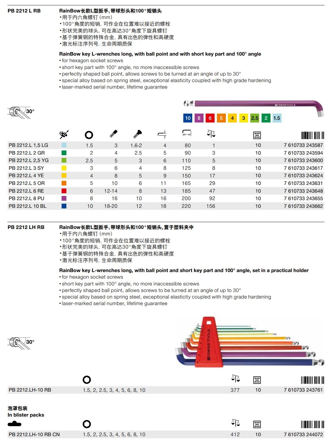 PB RainBow长款球头L型内六角扳手/100°短销头