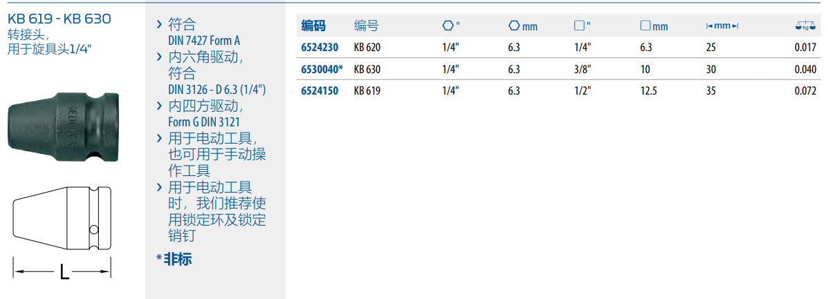 符合 DIN 7427 Form A 标准, 内六角驱动符合 DIN 3126 - D 6.3 (1/4") 标准,内四方驱动符合 Form G DIN 3121 标准,可用于动力工具或手动操作,用于动力工具时,推荐使用锁定环及锁定销钉L=35mm