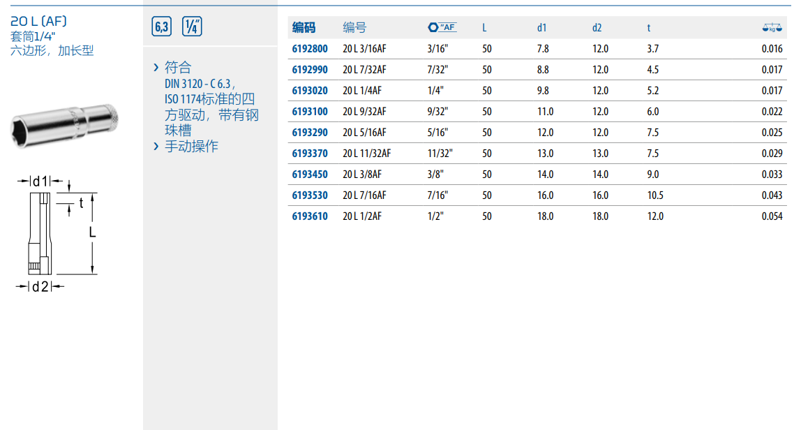 › 符合DIN 3120 - C 6.3,ISO 1174标准的四方驱动,带有钢珠槽