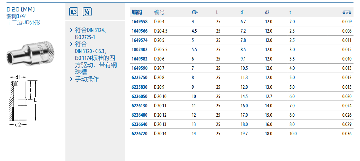 › 符合DIN 3120 - C 6.3,ISO 1174标准的四方驱动,带有钢珠槽