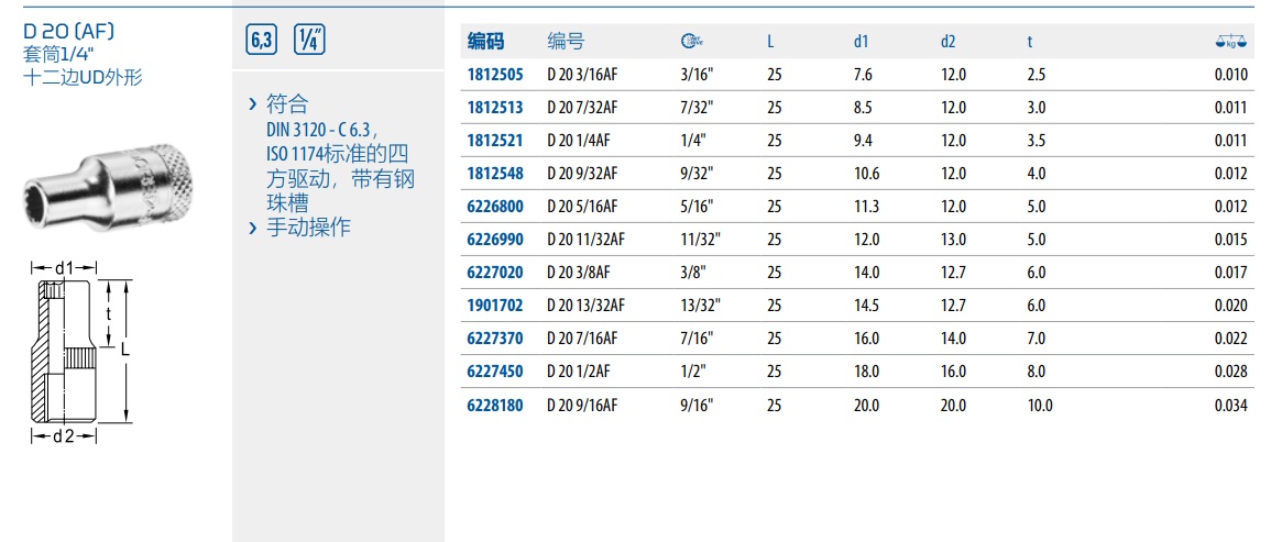 › 符合DIN 3120 - C 6.3,ISO 1174标准的四方驱动,带有钢珠槽