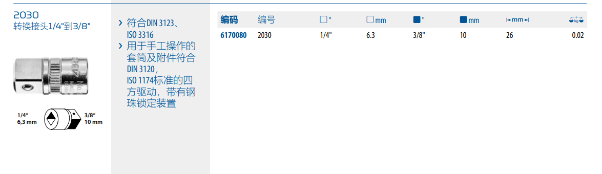 › 用于手工操作的套筒及附件符合DIN 3120,ISO 1174标准的四方驱动,带有钢珠锁定装置