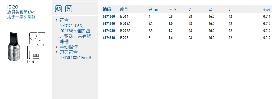 › 符合DIN 3120 - C 6.3,ISO 1174标准的四方驱动,带有钢珠槽