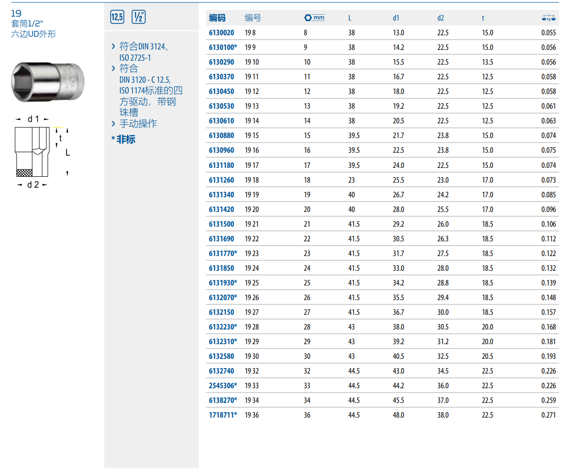 › 符合DIN 3120 - C 12.5ISO 1174标准的四方驱动,带钢珠槽