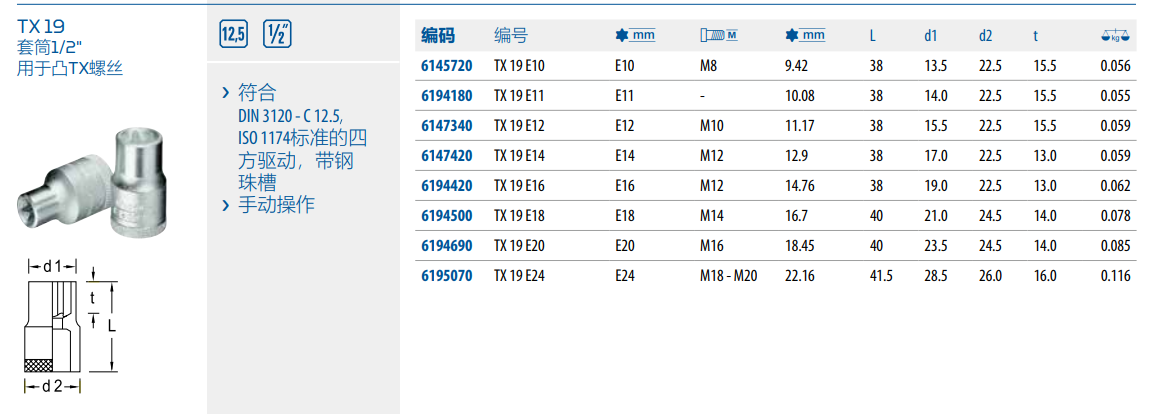 › 符合DIN 3120 - C 12.5ISO 1174标准的四方驱动,带钢珠槽
