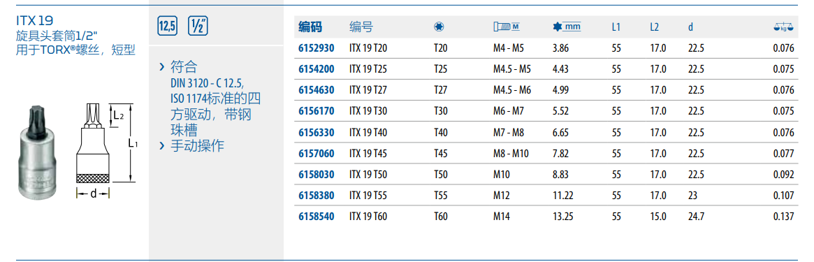 › 符合DIN 3120 - C 12.5ISO 1174标准的四方驱动,带钢珠槽