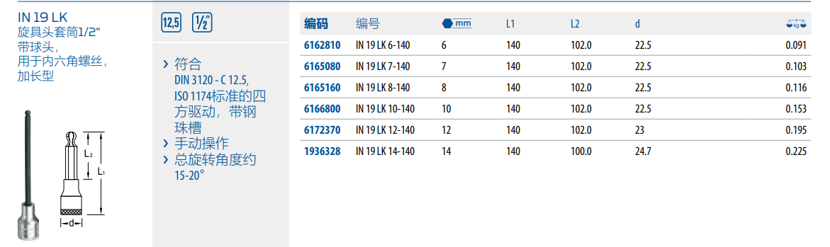 › 符合DIN 3120 - C 12.5ISO 1174标准的四方驱动,带钢珠槽