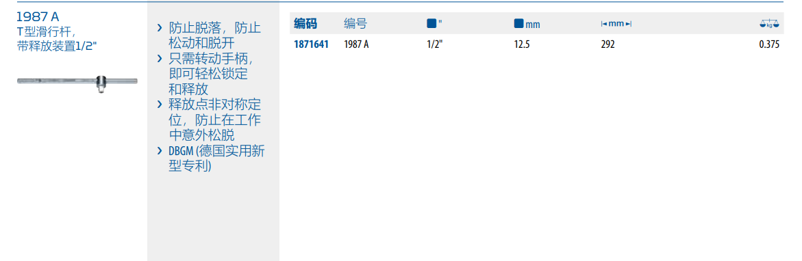 Gedore 1/2 T型滑行杆,带释放装置