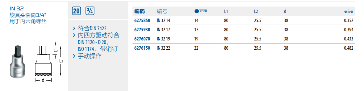 › 内四方驱动符合DIN 3120 - D 20,ISO 1174,带销钉