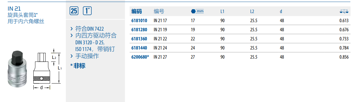 › 内四方驱动符合DIN 3120 - D 25ISO 1174,带销钉