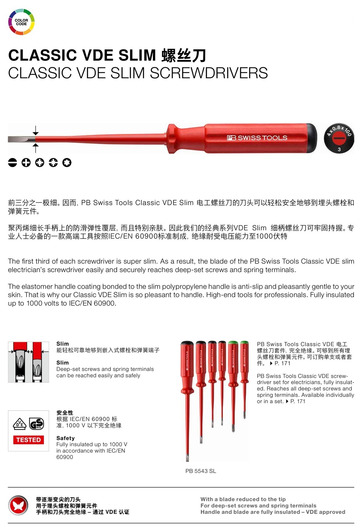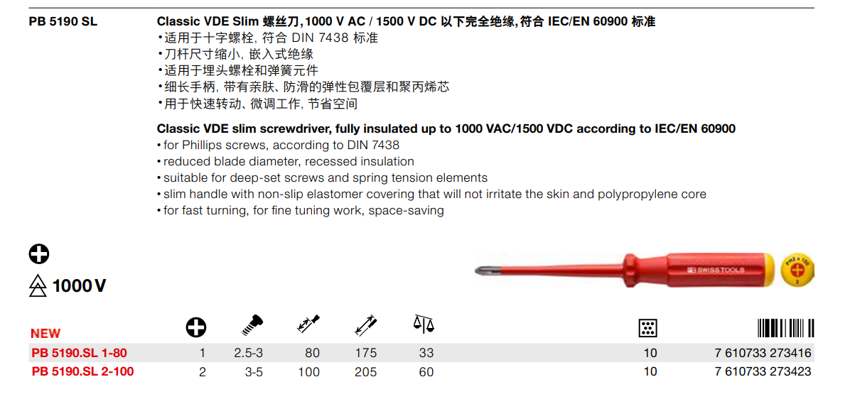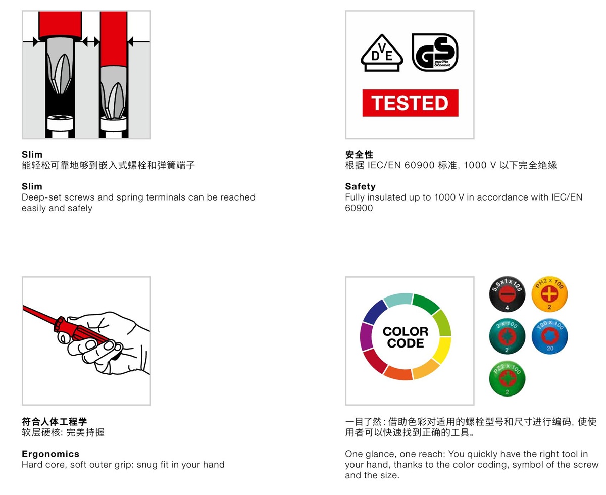 经典VDE细刀杆螺丝刀,完全绝缘,最高可达1000 V AC / 1500 V DC,符合IEC/EN 60900