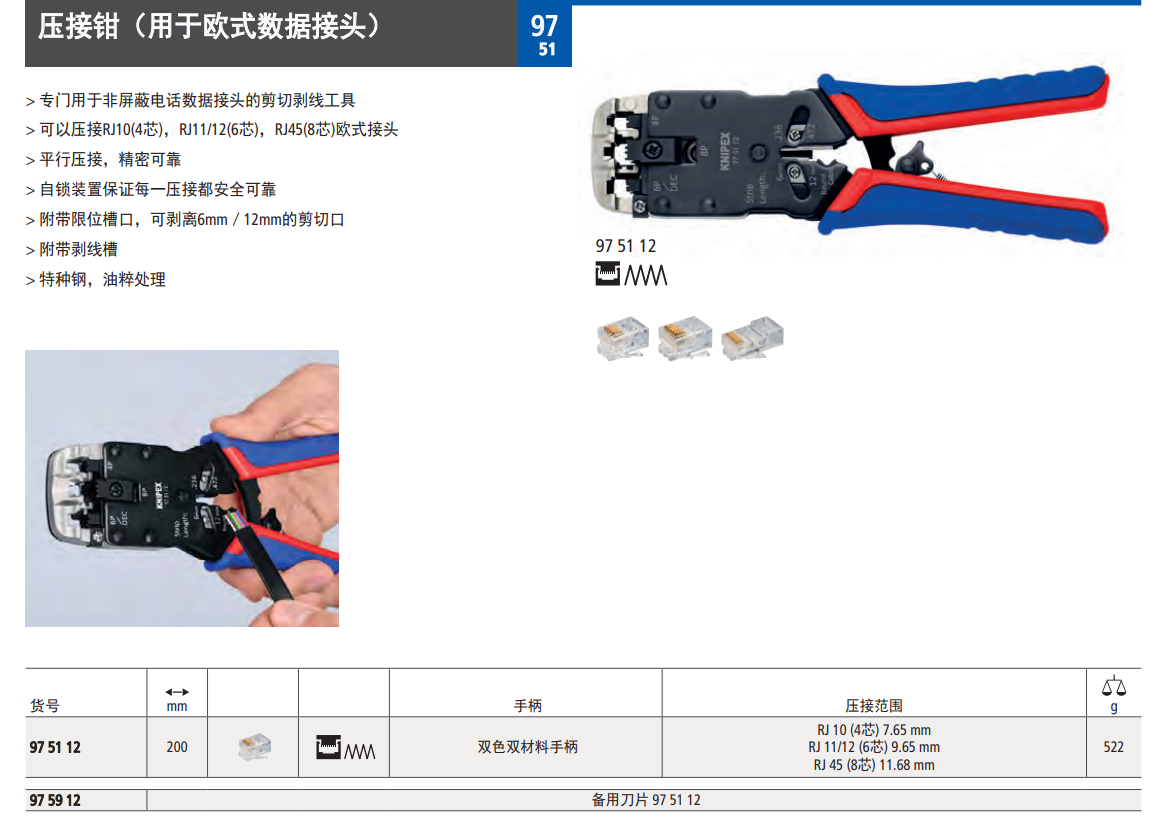 > 可以压接RJ10(4芯),RJ11/12(6芯),RJ45(8芯)欧式接头