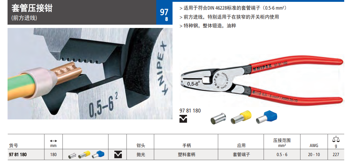 > 适用于符合DIN 46228标准的套管端子(0.5-6 mm²)