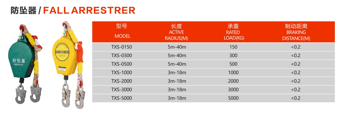 防坠器采用“双锁止装置”结构,锁止稳定,系数高,可靠性好,并有效地解决因倾斜作业下坠摇摆幅度过大而撞击其他物体而导致的事故。防坠器的控制系统采用特种钢,并经特种处理,质轻、耐磨、耐腐蚀、抗冲击,外壳采用铝合金,质轻,不老化。高空防坠器绳索选用防旋转钢丝绳,吊绳,均做阻燃处理,耐200℃高温。