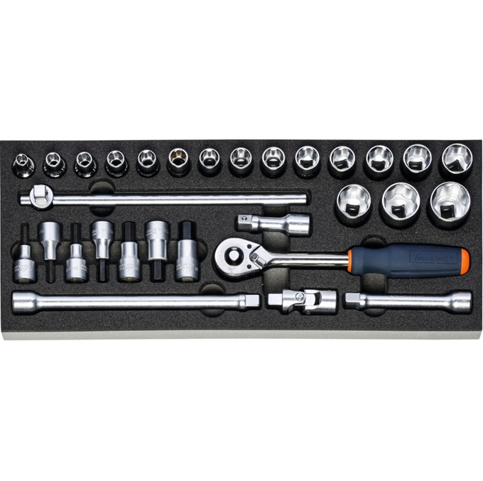 其中 4 个可组合随附的高品质专业工具装配。包括以下组合:螺栓扳手,套筒扳手 1/2 英寸,螺丝刀,钳子,锤子,锉刀,冲击工具,批头,弯头螺丝刀和补充物品。
