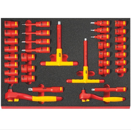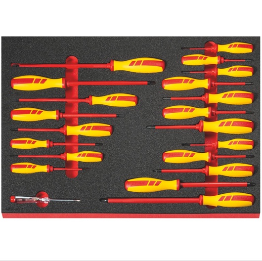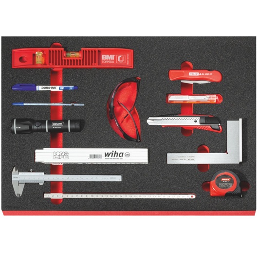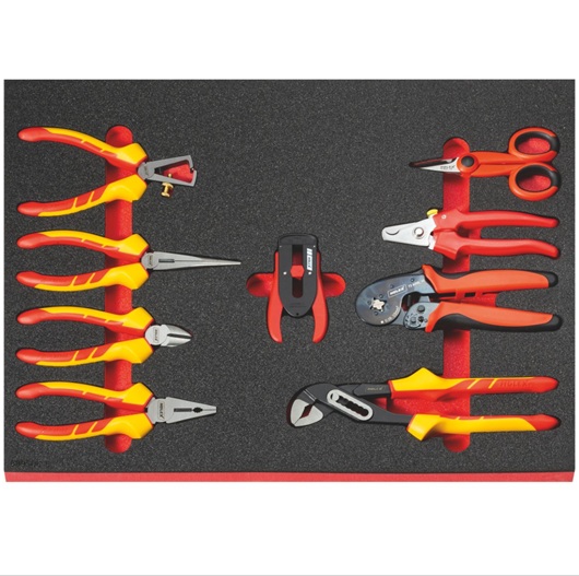 手、螺丝起子和用于剥线、切削和压接的补充物品和工具。上方 5 个抽屉的工具位于充分契合的双色聚乙烯硬质泡沫材料刻模中,因此所有工具在车间用小车中都有预定位置。其余 2 个抽屉可单独配置。