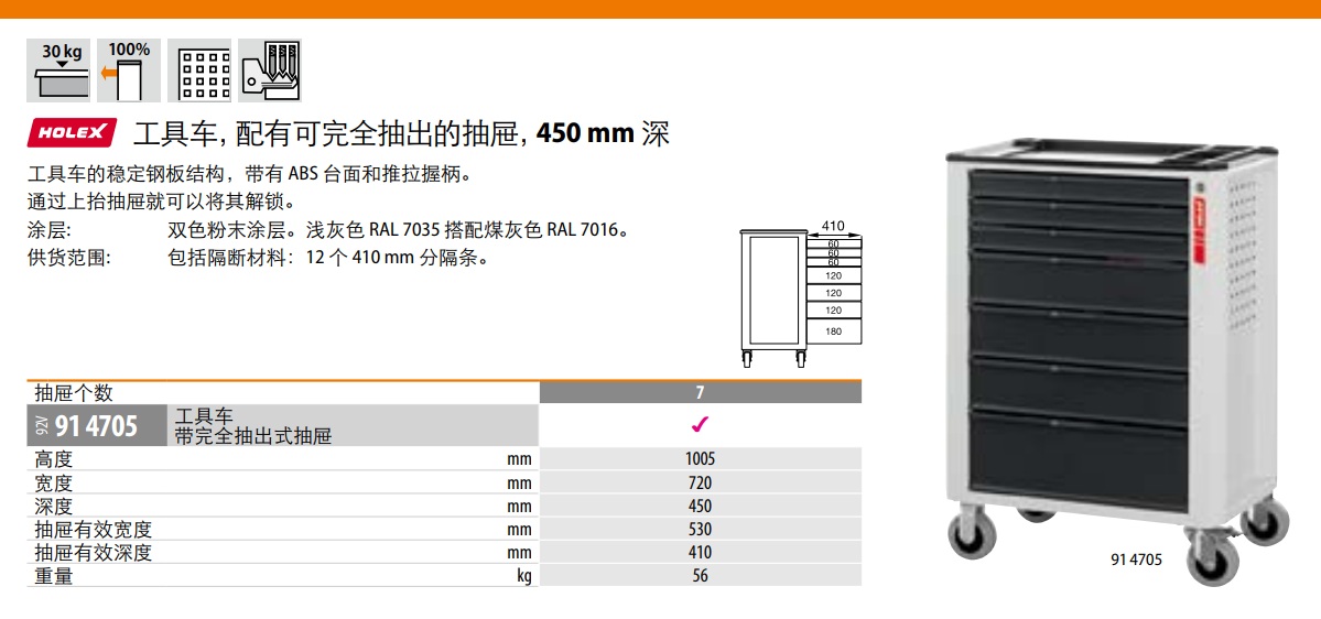 HOLEX 7抽工具车,配有可完全抽出的抽屉