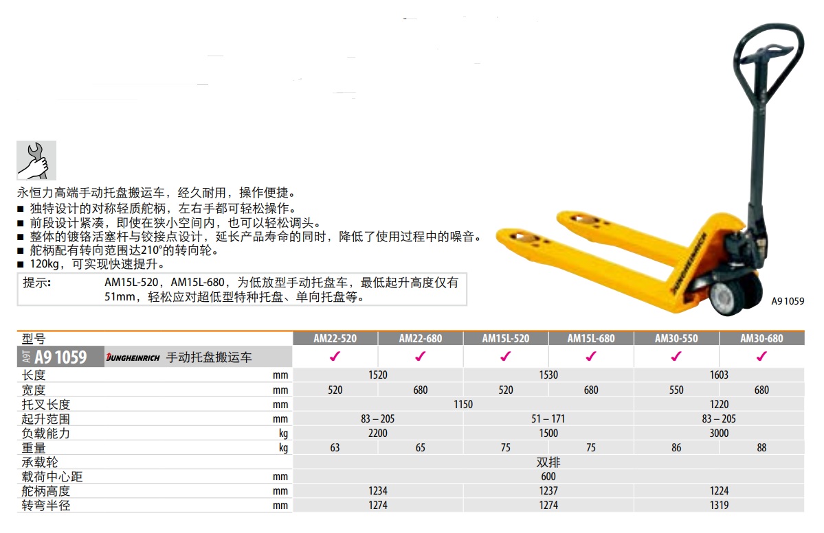提示: AM15L-520,AM15L-680,为低放型手动托盘车,最低起升高度仅有51mm,轻松应对超低型特种托盘、单向托盘等。