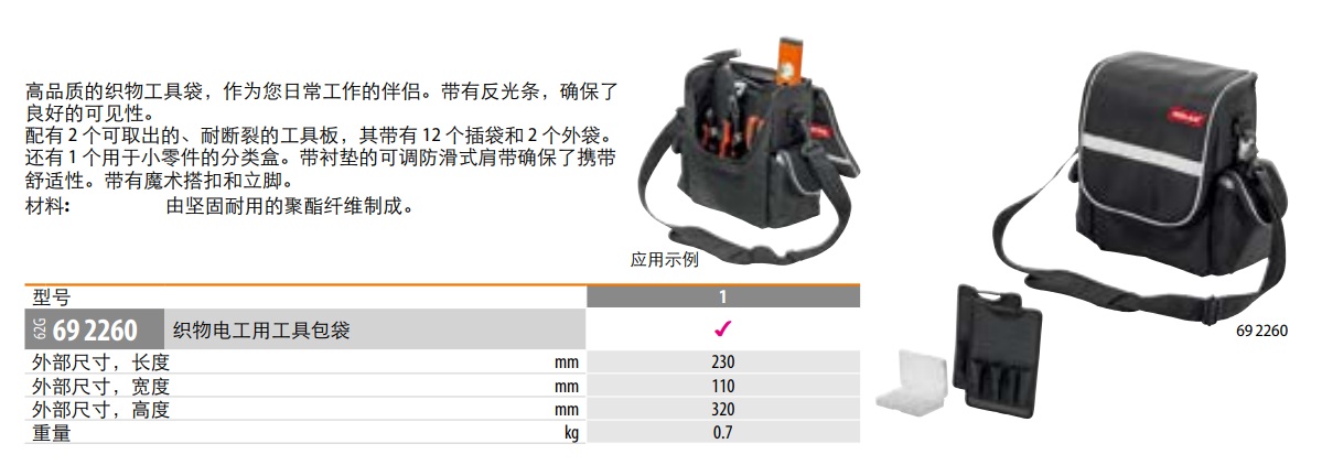 还有 1 个用于小零件的分类盒。带衬垫的可调防滑式肩带确保了携带舒适性。带有魔术搭扣和立脚。