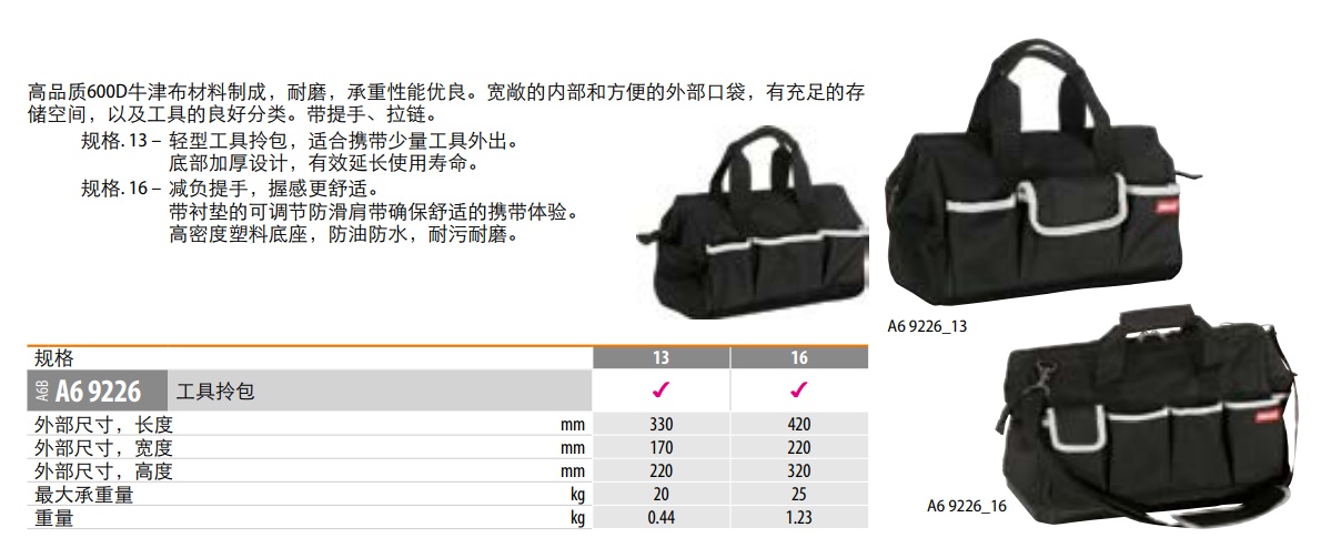 规格. 13 – 轻型工具拎包,适合携带少量工具外出。