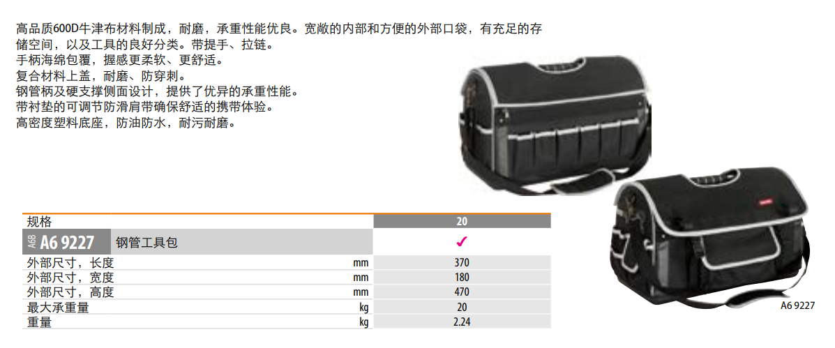 高品质600D牛津布材料制成,耐磨,承重性能优良。宽敞的内部和方便的外部口袋,有充足的存储空间,以及工具的良好分类。带提手、拉链。