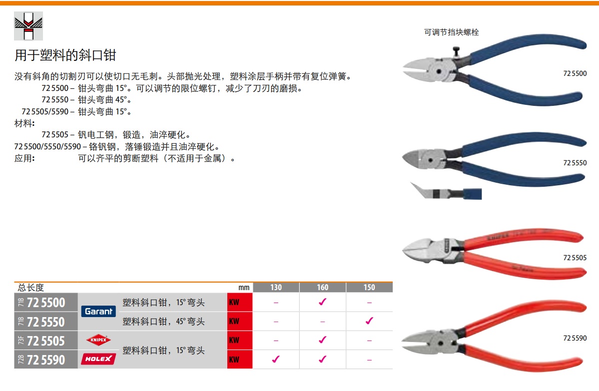 72 5500 – 钳头弯曲 15°。可以调节的限位螺钉,减少了刀刃的磨损。