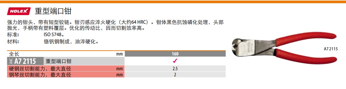 强力的钳头,带有短型铰链。钳刃感应淬火硬化(大约64 HRC)。钳体黑色抗蚀磷化处理,头部抛光,手柄带有塑料覆层。优化的传动比,因而切割效率高。