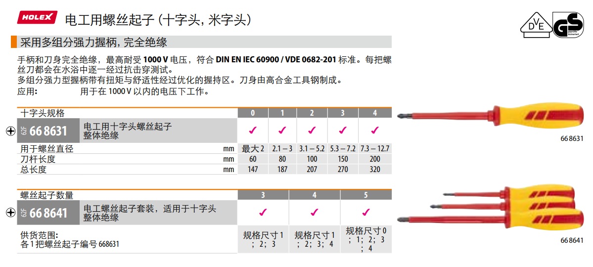 HOLEX 十字绝缘螺丝刀采用多组分强力握柄,完全绝缘