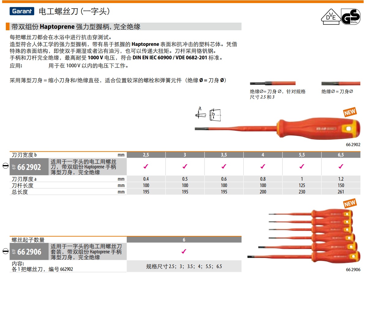 手柄和刀杆完全绝缘,最高耐受 1000 V 电压,符合 DIN EN IEC 60900 / VDE 0682-201 标准。