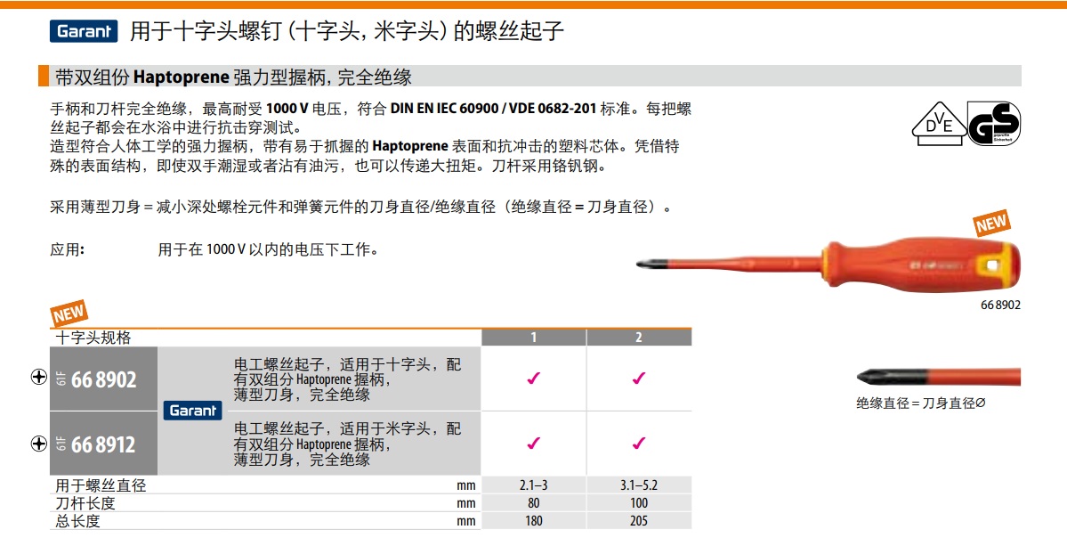 手柄和刀杆完全绝缘,最高耐受 1000 V 电压,符合 DIN EN IEC 60900 / VDE 0682-201 标准。每把螺丝起子都会在水浴中进行抗击穿测试。