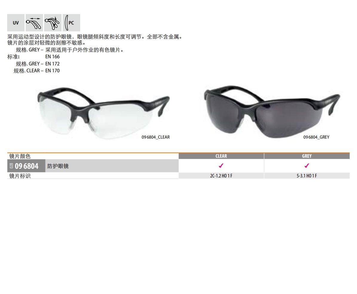 采用运动型设计的防护眼镜,眼镜腿倾斜度和长度可调节。全部不含金属。