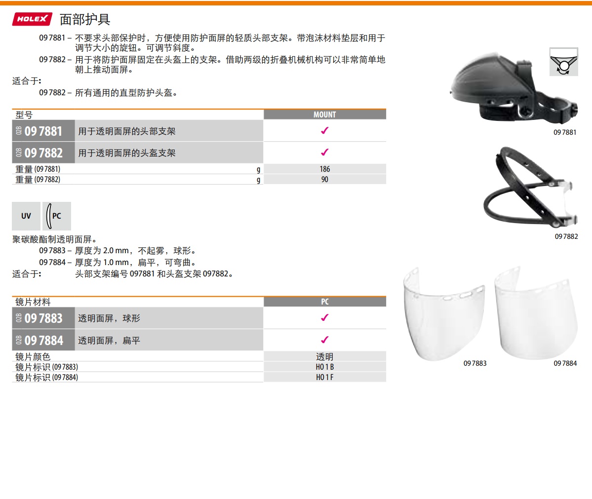 09 7881 – 不要求头部保护时,方便使用防护面屏的轻质头部支架。– 带泡沫材料垫层和用于调节大小的旋钮。可调节斜度。