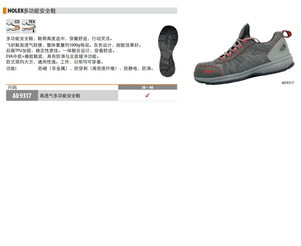 功能: 防砸(非金属),防穿刺(高密度纤维),防静电,防滑。