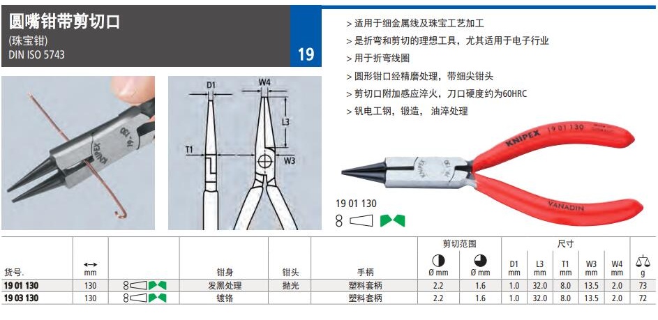 圆嘴钳带剪切口(珠宝钳)DIN ISO 5743> 适用于细金属线及珠宝工艺加工> 是折弯和剪切的理想工具,尤其适用于电子行业> 用于折弯线圈 > 圆形钳口经精磨处理,带细尖钳头> 剪切口附加感应淬火,刀口硬度约为60HRC> 钒电工钢,锻造, 油淬处理