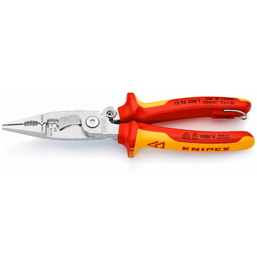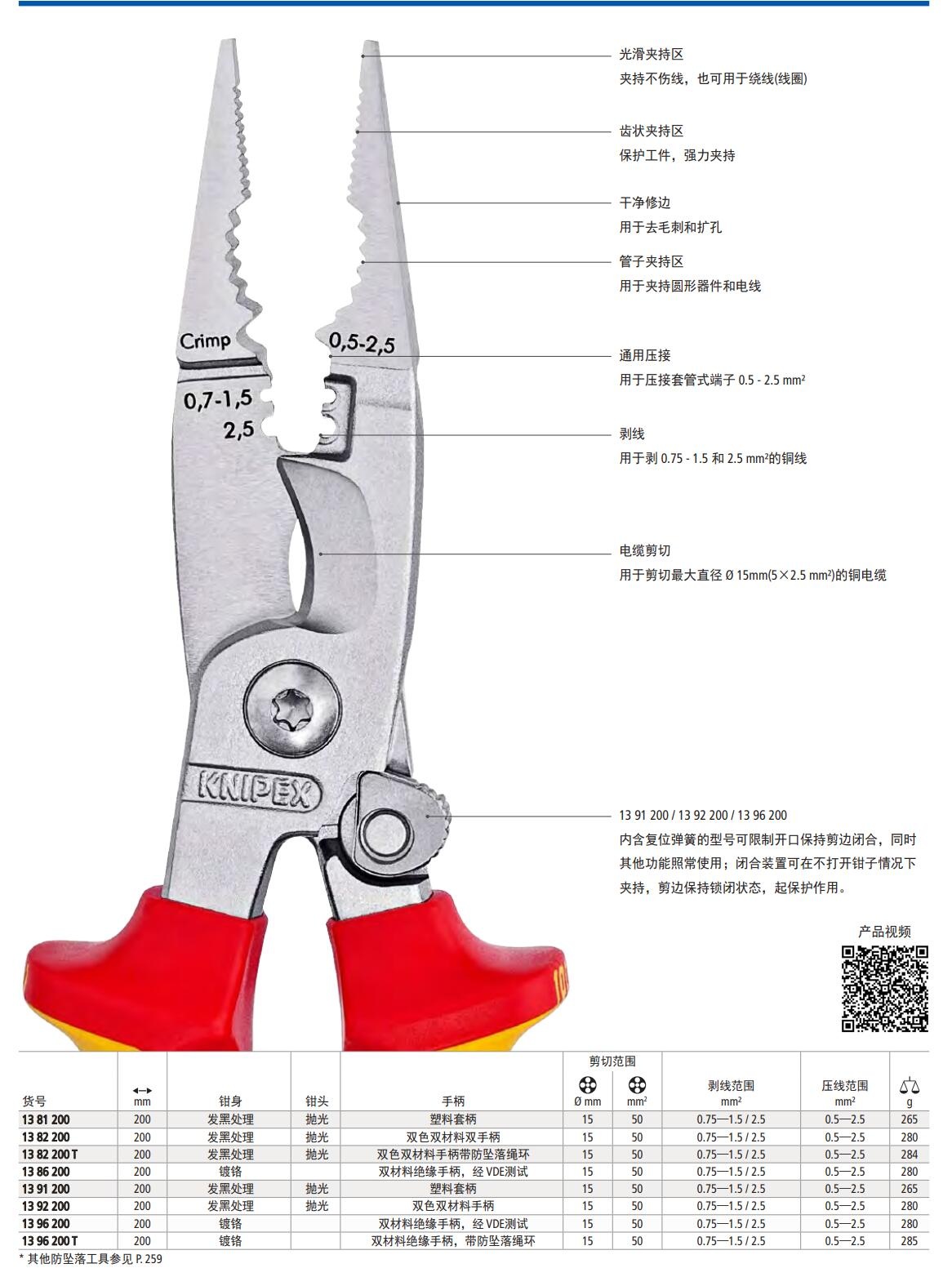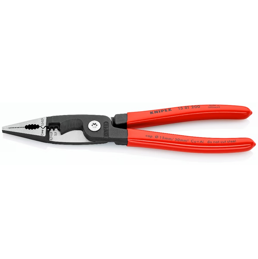 电工安装多功能钳,适用于夹持扁平、圆形材料,扳折,去毛刺,剪切电缆,剥线及压接套管端子6种功能集于一身
