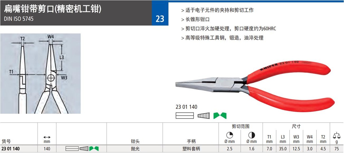 扁嘴钳带剪口(精密机工钳)DIN ISO 5745> 适于电子元件的夹持和剪切工作> 长锥形钳口> 剪切口淬火加硬处理,剪口硬度约为60HRC> 高等级特殊工具钢,锻造,油淬处理