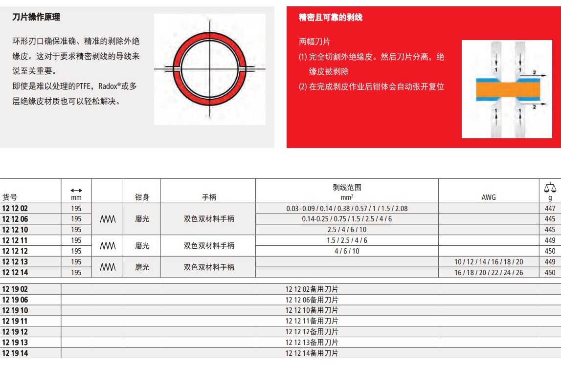 精密绝缘导线剥线钳> 适用于比较难以剥除的绝缘外皮,如PTFE, silicone,Radox®, Kapton® 以及橡胶材料、多层电缆等> 第二幅刀片夹持住剩余的绝缘线部分> 可替换刀片,精确贴合各种电线横截面> 带可调节长度定位器,适用于同等剥线长度重复作业> 钳身:铁质> 刀片:特殊工具钢,油淬处理