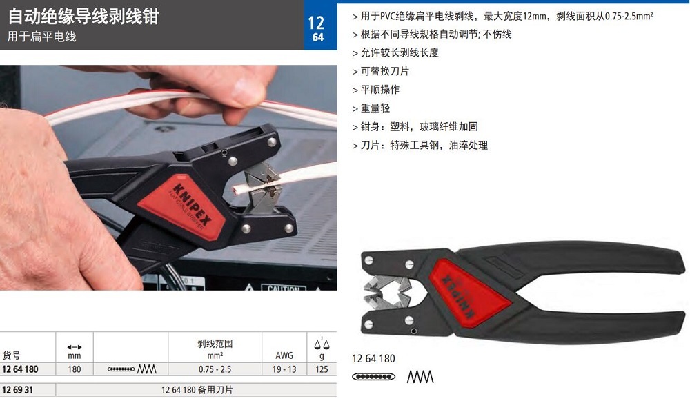 自动绝缘导线剥线钳,用于扁平电线> 用于PVC绝缘扁平电线剥线,最大宽度12mm,剥线面积从0.75-2.5mm²> 根据不同导线规格自动调节; 不伤线> 允许较长剥线长度 > 可替换刀片> 平顺操作> 重量轻> 钳身:塑料,玻璃纤维加固> 刀片:特殊工具钢,油淬处理