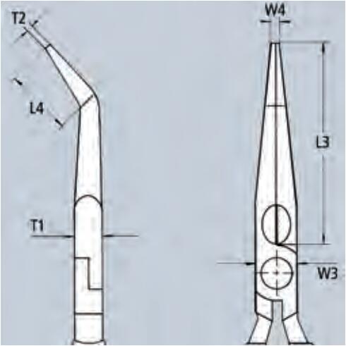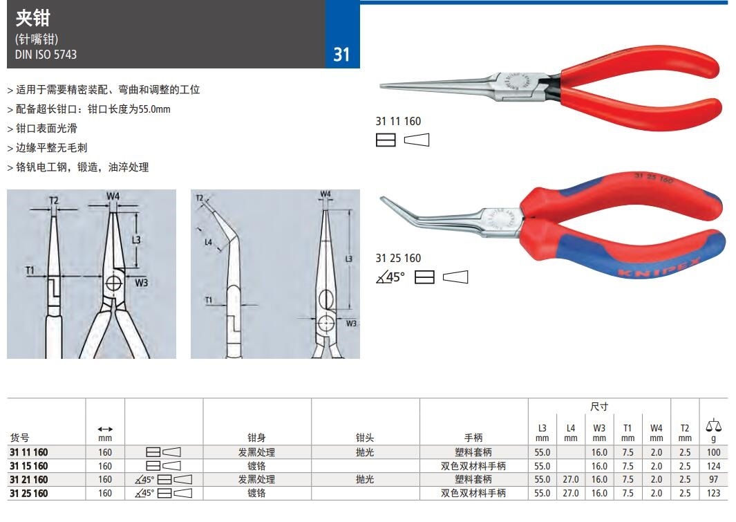 夹钳(针嘴钳)DIN ISO 5743> 适用于需要精密装配、弯曲和调整的工位> 配备超长钳口:钳口长度为55.0mm> 钳口表面光滑> 边缘平整无毛刺> 铬钒电工钢,锻造,油淬处理